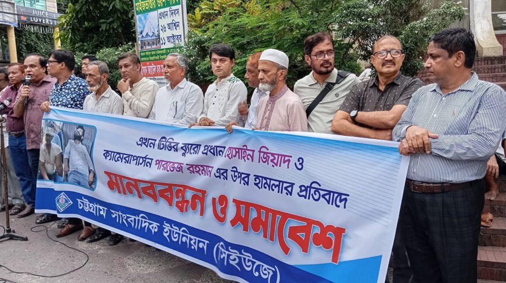 এখন টিভির চট্টগ্রাম ব্যুরো প্রধান হোসাইন জিয়াদ এবং ক্যামেরাপার্সন পারভেজ রহমানের উপর হামলার প্রতিবাদ ও বিচার দাবিতে মঙ্গলবার (৭ অক্টোবর) চট্টগ্রাম নগরের চেরাগিতে চট্টগ্রাম সাংবাদিক ইউনিয়নের (সিইউজে) মানববন্ধন ও প্রতিবাদ সমাবেশে বক্তব্য রাখছেন সিইউজের সভাপতি রিয়াজ হায়দার চৌধুরী।